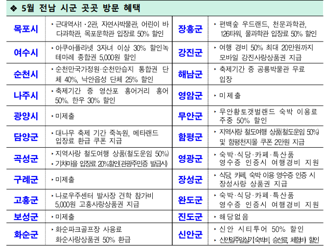전라남도에서는 5월 전남 방문의 달을 맞아 전남 지역 관광객들에게 숙백 및 체험시설 등 전국 최대 할인 혜택을 제공한다고 합니다.